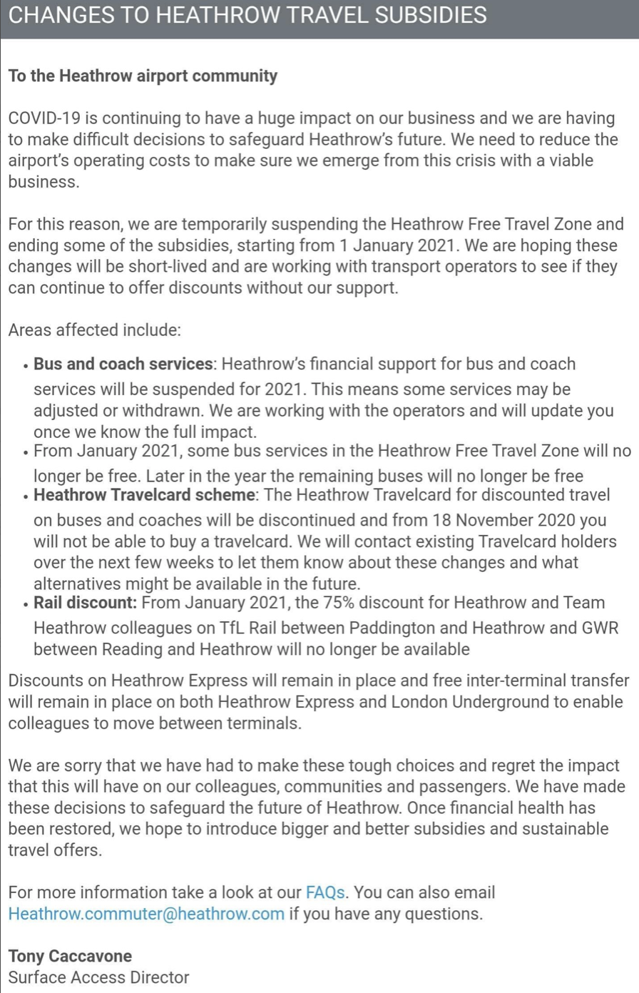 Email from Heathrow confirming the abolition of the Free Travel Scheme